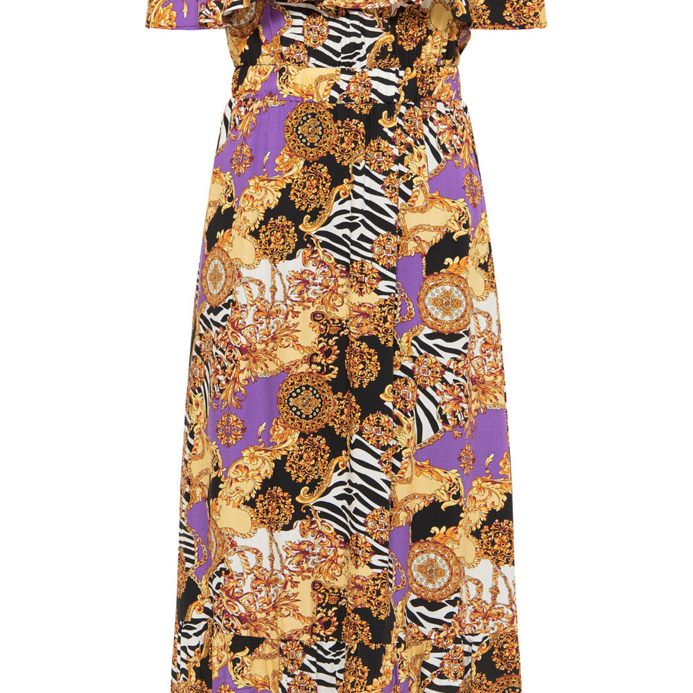 Als aufregendes Carmen Modell punktet es mit seinem gold-schwarzen Renaissance-Print, einem gesmokten Ausschnitt und einem Volant am Rock Teil.